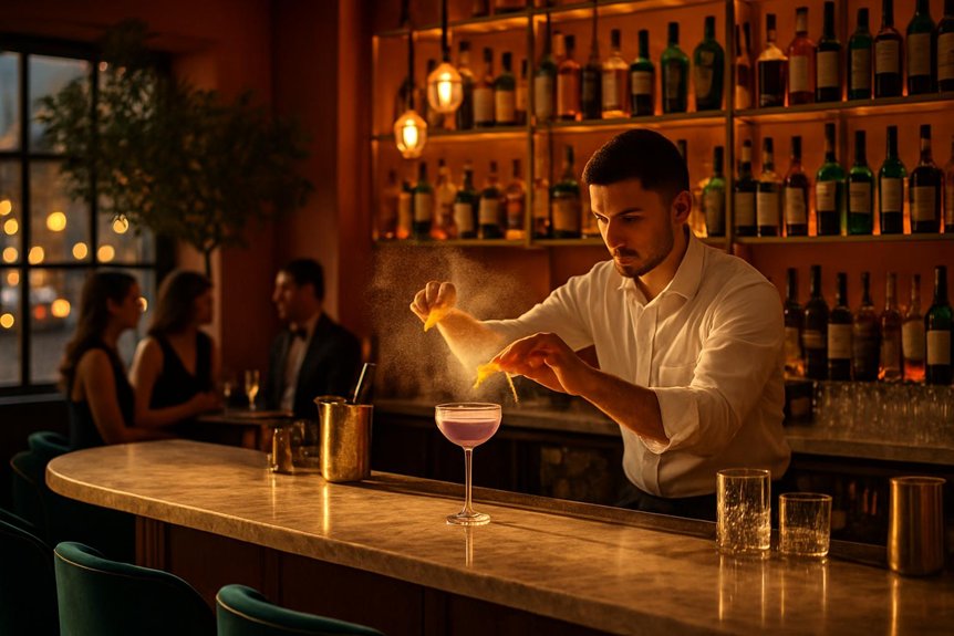 Precision anchors the bar: chilled coupes, measured dilution, disciplined shaking and stirring—bartending techniques executed without spectacle.