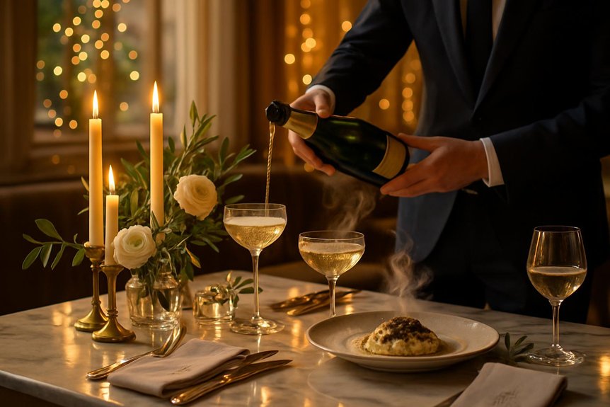 - Truffle-studded orzo; Blanc de Blancs frames richness with fine mousse.