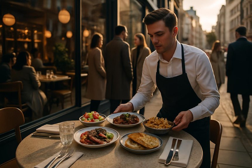 - 2. Togetherness: Colleagues share plates at a long table, synchronized courses arriving on cue.
